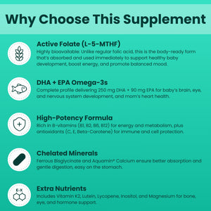 This complete supplement supports the healthy growth of your baby's brain, body, and eyes. It includes a comprehensive range of nutrients to nurture mothers from preconception through each trimester. Mother and child enjoy dependable, all-around care, promoting growth and vitality from the very beginning. Each ingredient helps strengthen defenses and overall wellbeing.