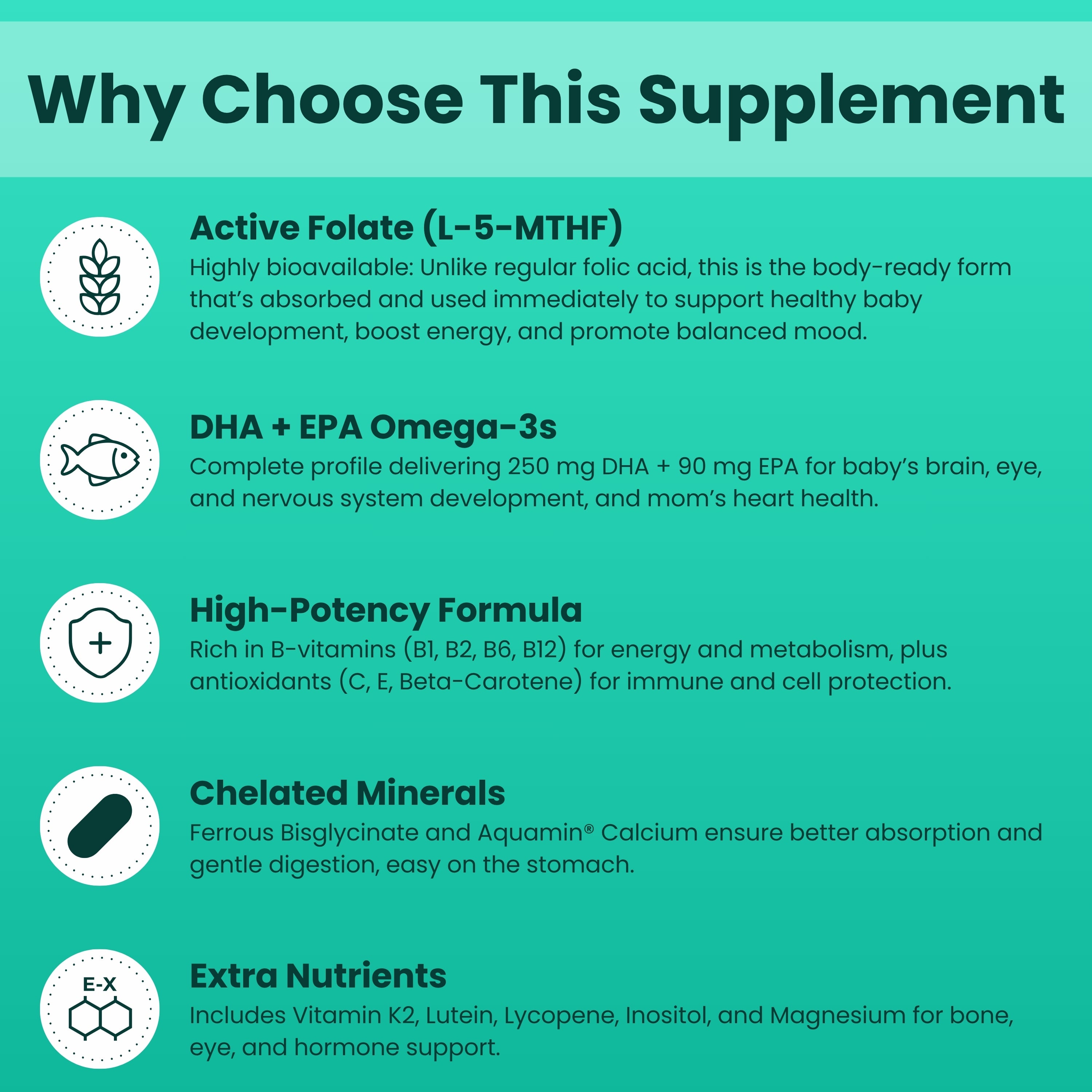 - High levels of folic acid, DHA, lutein, iron, and essential vitamins nurture your baby's growth.