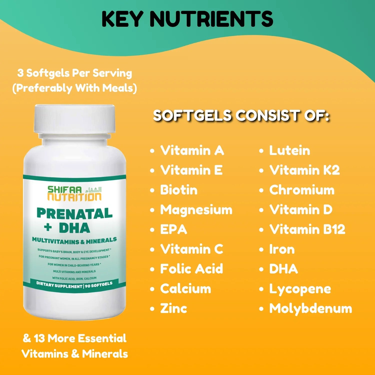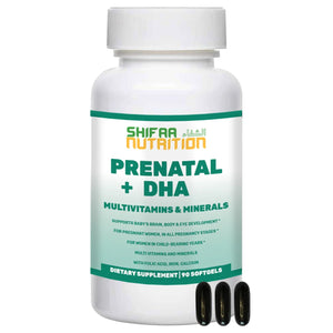 Introducing SHIFAA NUTRITION Prenatal + DHA, a formula created for mothers-to-be. Every serving contains essential, top-quality nutrients. You and your baby receive much-needed support during this important journey. The chosen ingredients guarantee purity, safety, and effectiveness, helping provide reliable nutrition as you move from conception through pregnancy.