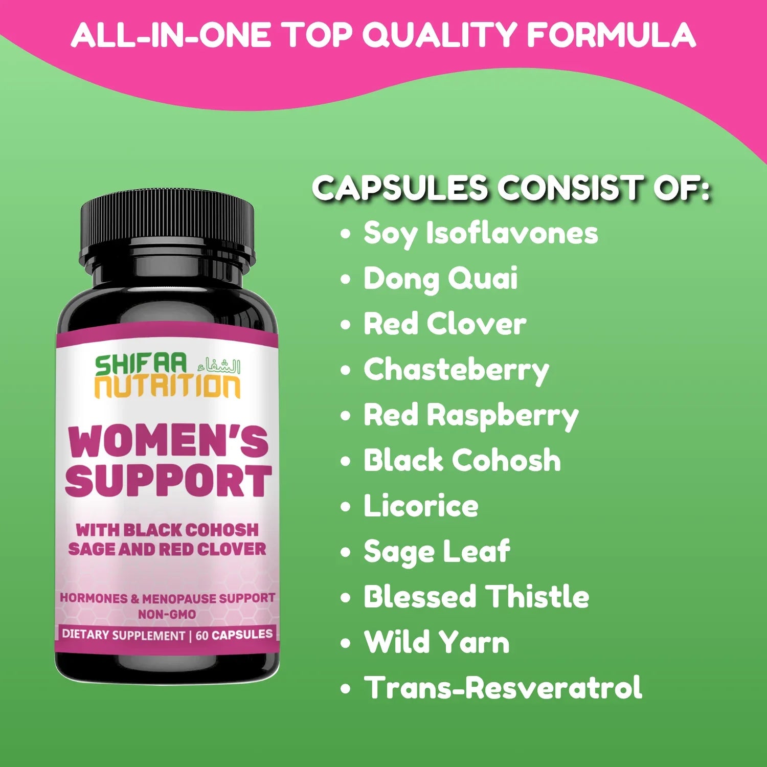 • POTENT INGREDIENTS: SHIFAA NUTRITION Women Support is A Menopause Support Supplement Made With Soy Isoflavones, Black Cohosh, Dong Quai, Licorice, Red Clover, Sage, Chasteberry, Blessed Thistle, Red Raspberry Powder, Wild Yam, and Trans-Resveratrol.