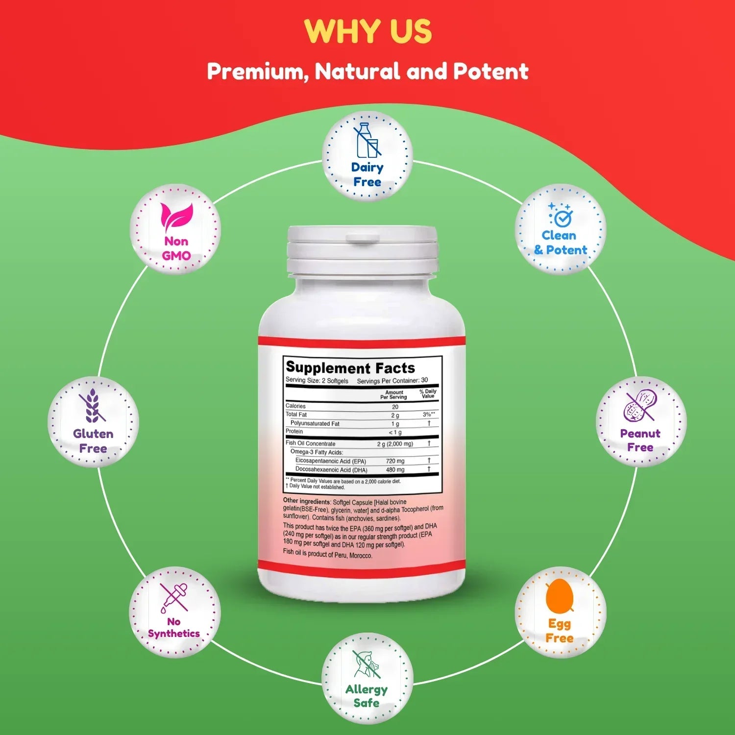 2 Soft Gels Per Serving. Double Strength Halal Fish Oil bottle has 60 Soft Gels, and It will last for 30 days.