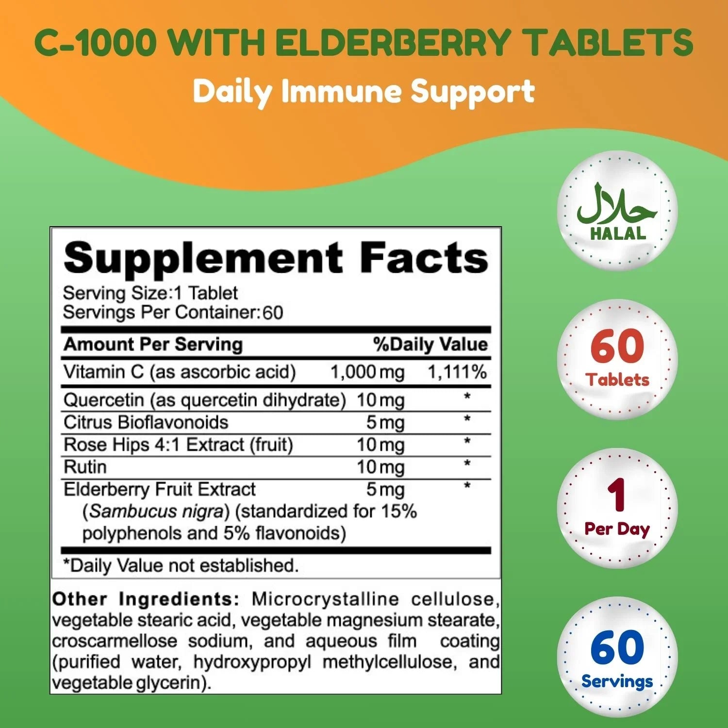 • 1000 MG HALAL VITAMIN C SUPPLEMENT: Our Halal Vitamin C 1000 mg includes Elderberry, Citrus Bioflavonoids, Rose Hip, and Rutin. These Vitamin C tablets are Vegetarian, non-GMO, and sugar-free.