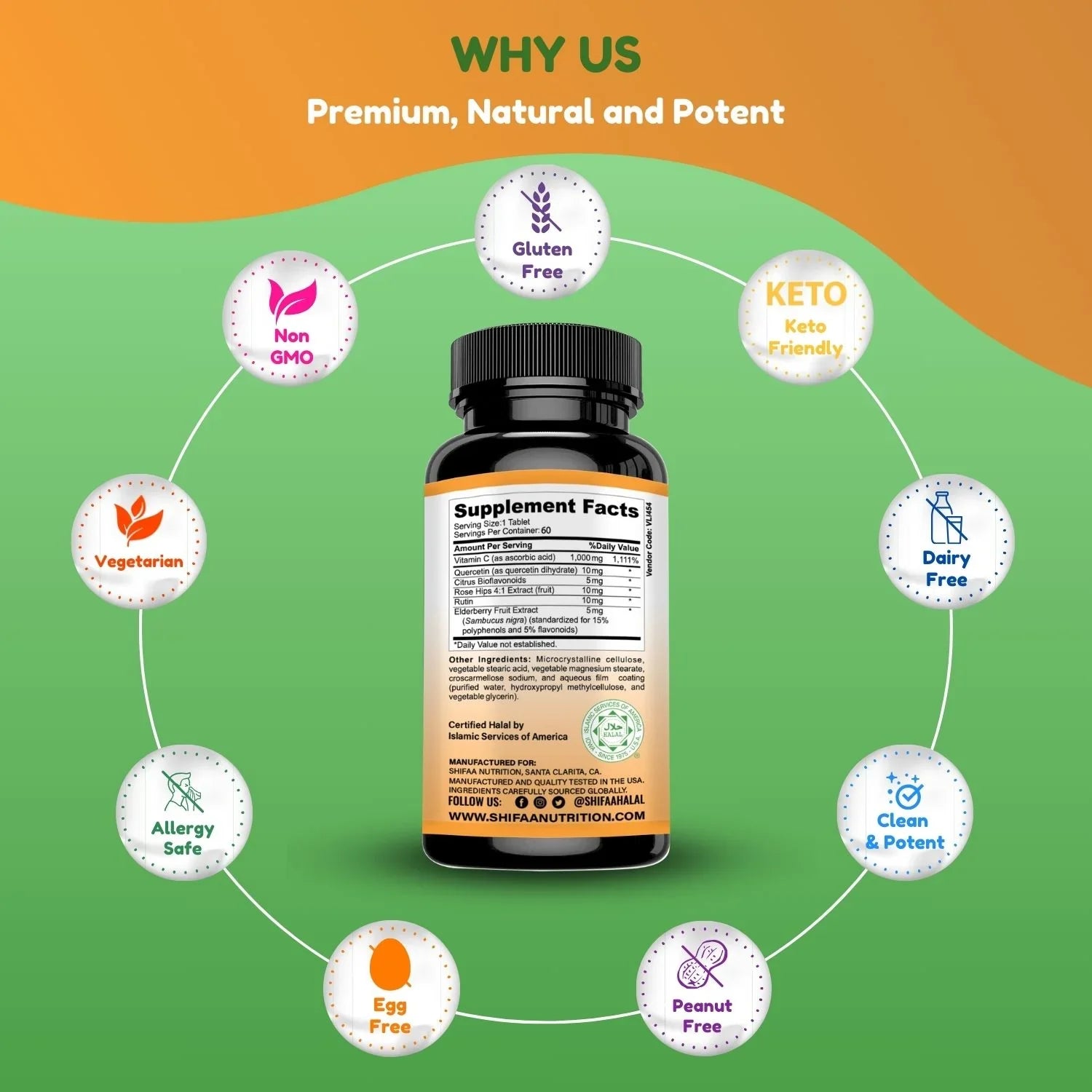 This supplement delivers a potent 1000 mg dose of Halal Vitamin C combined with elderberry, rose hips, rutin, quercetin, and citrus bioflavonoids. Together, these ingredients help strengthen your body's natural defenses. The unique blend supports wellness and promotes overall vitality.